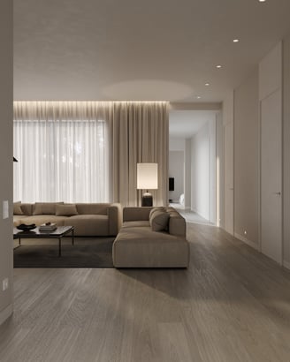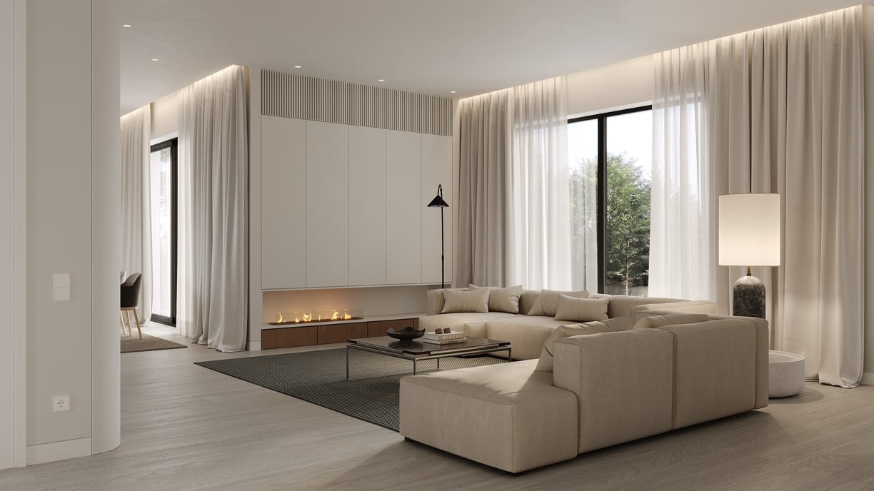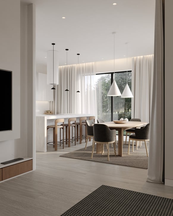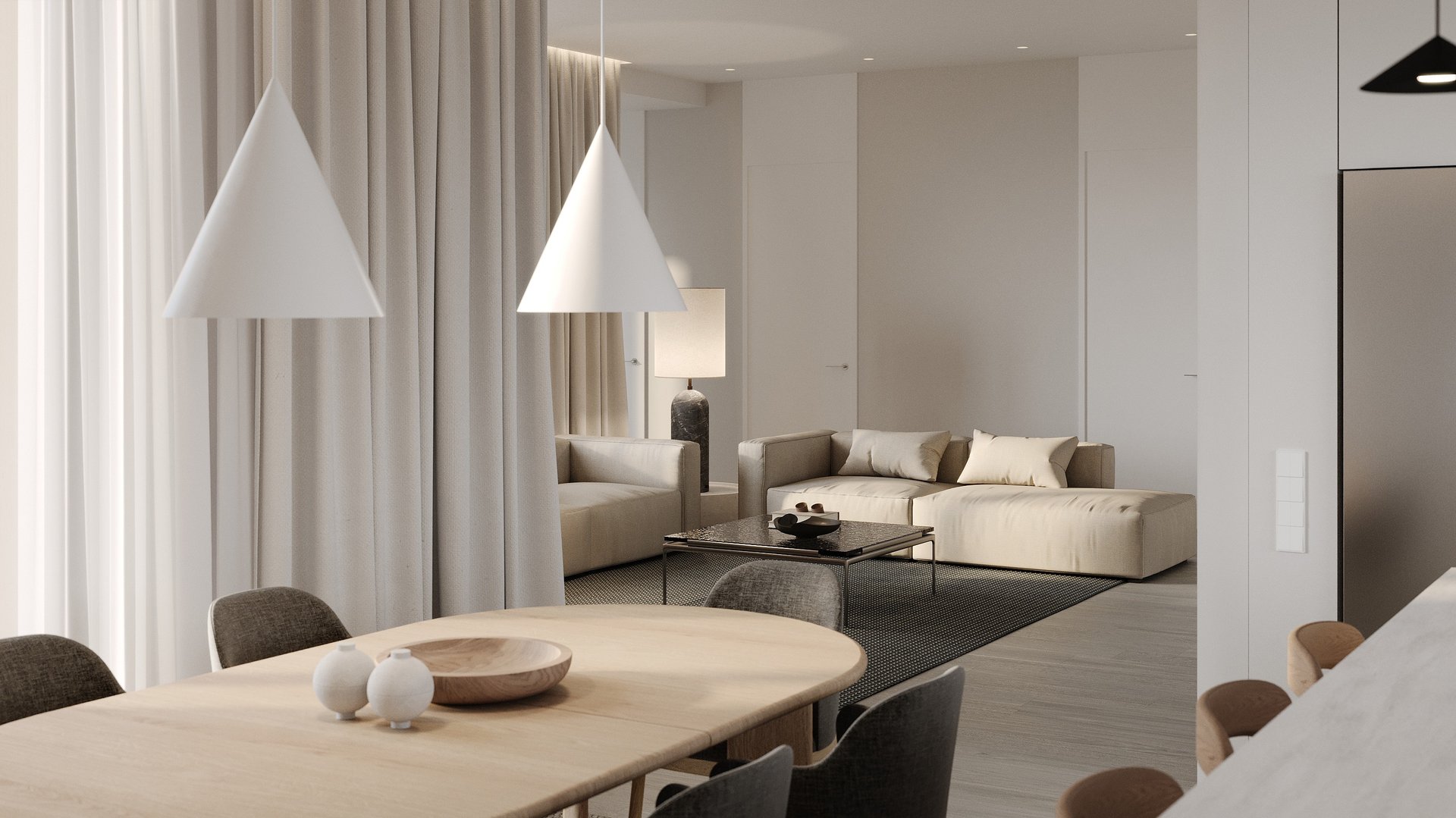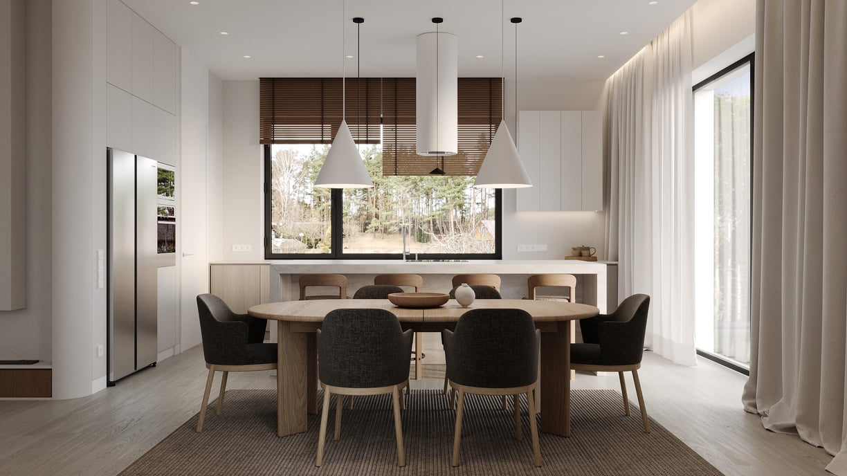 Svetainė ir virtuvė tampa bendros būties centru – vieta, kur tyliai spragsi ugnis, o šiltas vakarienės kvapas pasiekia net tolimiausią svetainės kampelį. Erdvi virtuvės sala tarsi kviečia į ilgus, lėtus pokalbius, o minkšti paviršiai, šviesios spalvos ir kruopščiai parinkti akcentai kuria tylų foną gyvenimui, kuriame gera būti.